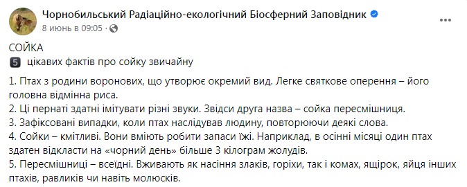 Чернобыльский радиационно-экологический биосферный заповедник опубликовал подборку любопытных фактов об обычной сойке. Практически любой житель Украины наверняка встречал эту птицу и слышал ее хохот или крики.