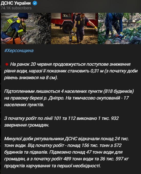 В Херсонской области продолжается постепенное снижение уровня воды. Фото: ГСЧС