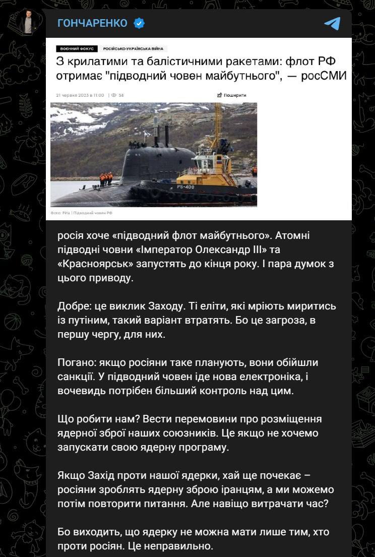 "Если Запад против нашей ядерки, пусть подождет – россияне сделают ядерное оружие иранцам, а мы можем потом повторить вопрос. Но зачем тратить время?", - пишет Гончаренко.