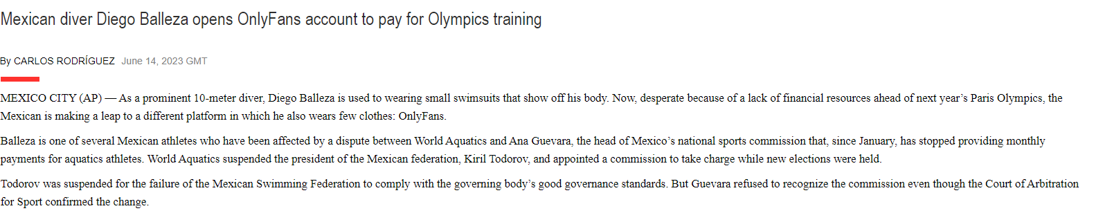 Известный спортсмен мексиканской сборной по синхронным прыжкам в воду Диего Бальеса решил завести аккаунт на эротической платформе OnlyFans, чтобы заработать на участие в Олимпиаде.