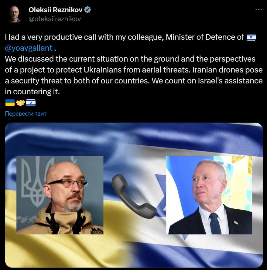 "Мы обсудили текущую ситуацию на земле и перспективы проекта по защите украинцев от воздушных угроз. Иранские беспилотники представляют угрозу безопасности для обеих наших стран. Рассчитываем на помощь Израиля в противодействии им", - сообщил Резников.