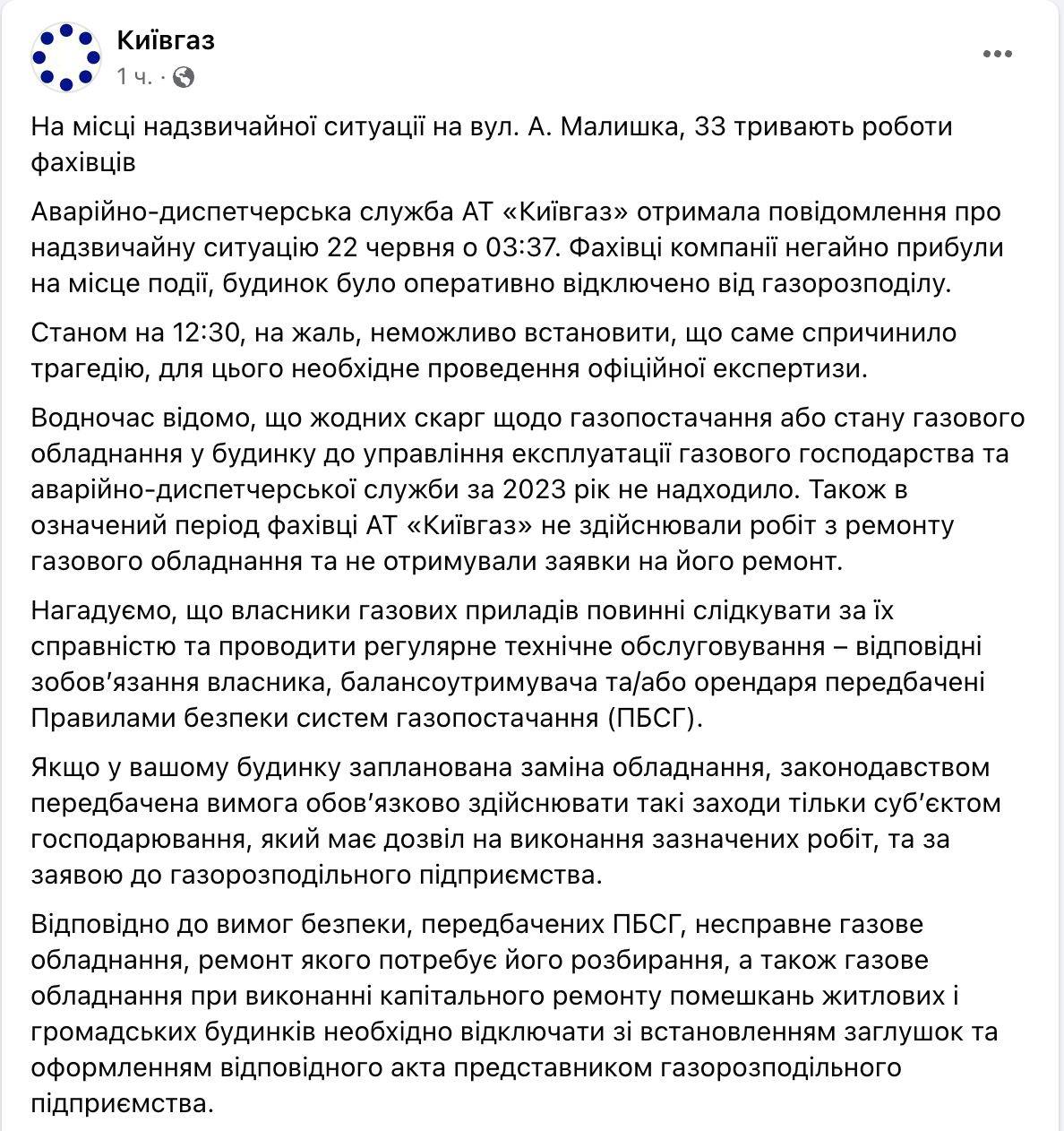 "Никаких жалоб на газоснабжение или состояние газового оборудования в здании в управление эксплуатации газового хозяйства и аварийно-диспетчерской службы за 2023 год не поступало. Также в указанный период специалисты АО "Киевгаз" не производили работы по ремонту газового оборудования и не получали заявки на его ремонт", - говорится в посте.