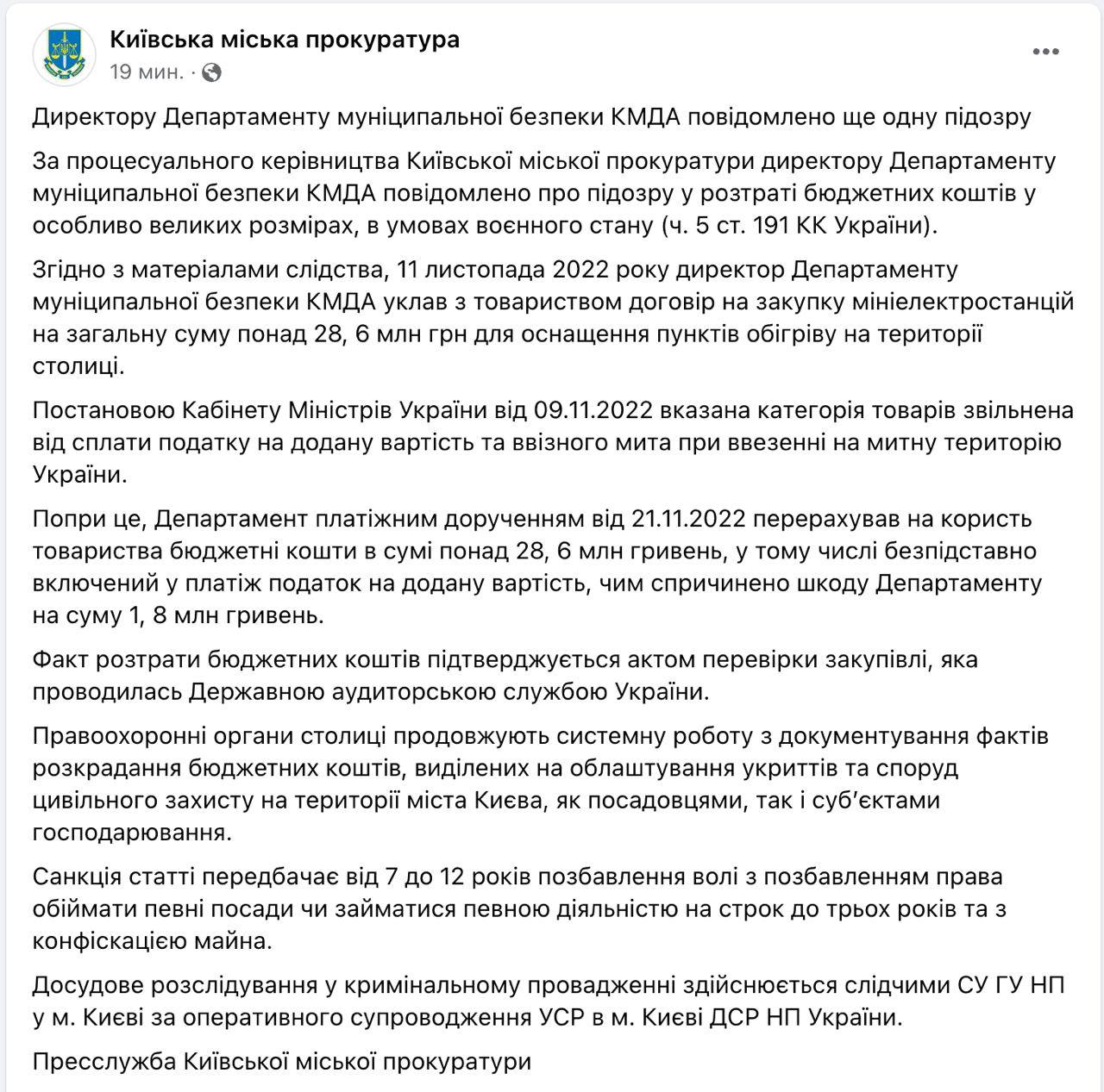 "Несмотря на это, Департамент платежным поручением от 21.11.2022 перечислил в пользу компании бюджетные средства в сумме свыше 28,6 млн гривен, в том числе безосновательно включенный в платеж налог на добавленную стоимость, чем причинен вред Департаменту на сумму 1,8 млн гривен. Факт растраты бюджетных средств подтверждается актом проверки закупки, проводимой Государственной аудиторской службой Украины", - сказано в посте.