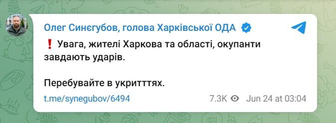 03:10 Удары по Харькову и области подтвердил глава Харьковской ОВА Олег Синегубов.