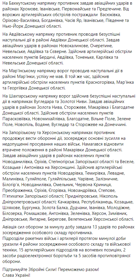 - Авиация и подразделения ракетных войск и артиллерии ВСУ продолжают активные действия против врага. За минувшие сутки авиация сил обороны нанесла 13 ударов по районам сосредоточения личного состава противника. Подразделения ракетных войск и артиллерии за прошедшие сутки поразили 4 района сосредоточения личного состава и военной техники, 15 артиллерийских подразделений на огневых позициях, 2 средства радиоэлектронной борьбы и 5 средств ПВО.