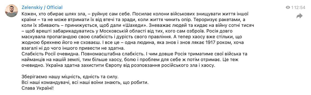 "Каждый, кто выбирает путь зла, разрушает сам себя. Унижает людей и бросает на войну сотни тысяч – чтобы наконец забаррикадироваться в Московской области от тех, кого сам вооружил. Россия долго маскировала пропагандой свою слабость и глупость своего правления. А теперь хаоса уже столько, что ни одной ложью его не утаишь. Слабость России очевидна. Полномасштабная слабость. И чем дольше Россия будет держать свои войска и наемников на нашей земле, тем больше хаоса, боли и проблем для себя потом получит", - написал Зеленский.
