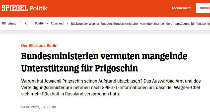 По данным издания, во время устного брифинга политический директор Федерального министерства иностранных дел Тервен Беллманн и парламентский государственный секретарь по обороне Зимтье Меллер высказали мнение, что Пригожин не получил от российских государственных сил поддержки, на которую надеялся, в попытке государственного переворота, и потому остановил поход на Москву.