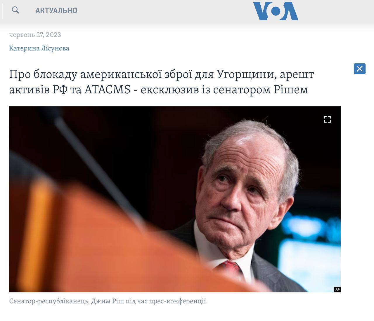 Об этом заявил американский сенатор-республиканец Джим Риш в интервью "Голосу Америки".