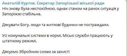 Так, в Запорожье воздушная тревога длилась почти три часа. По данным секретаря горсовета Алексея Куртева, ночь была неспокойной, но на утро ситуация в городе стабильная. Пострадавших нет, жилые дома не пострадали, все коммунальные системы в норме, службы работают в штатном режиме.