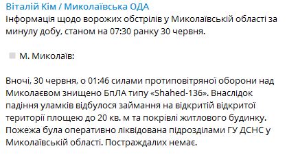 Ночью 30 июня во время воздушной атаки силы РФ ударили по Николаеву и Запорожью. Из тяжелой артиллерии били по Никополю.