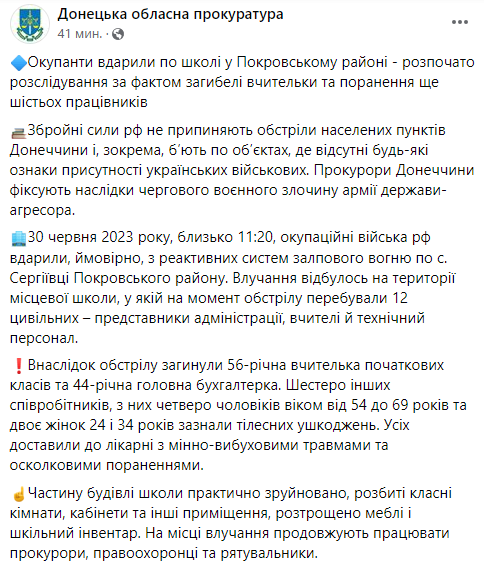 В селе Сергеевка Покровского района Донецкой области два человека погибших и шестеро были ранены в результате обстрела школы.