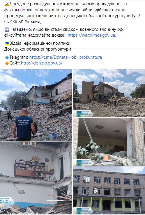 Последствия обстрела школы в донецком селе. Фото: Донецкой облпрокуратуры