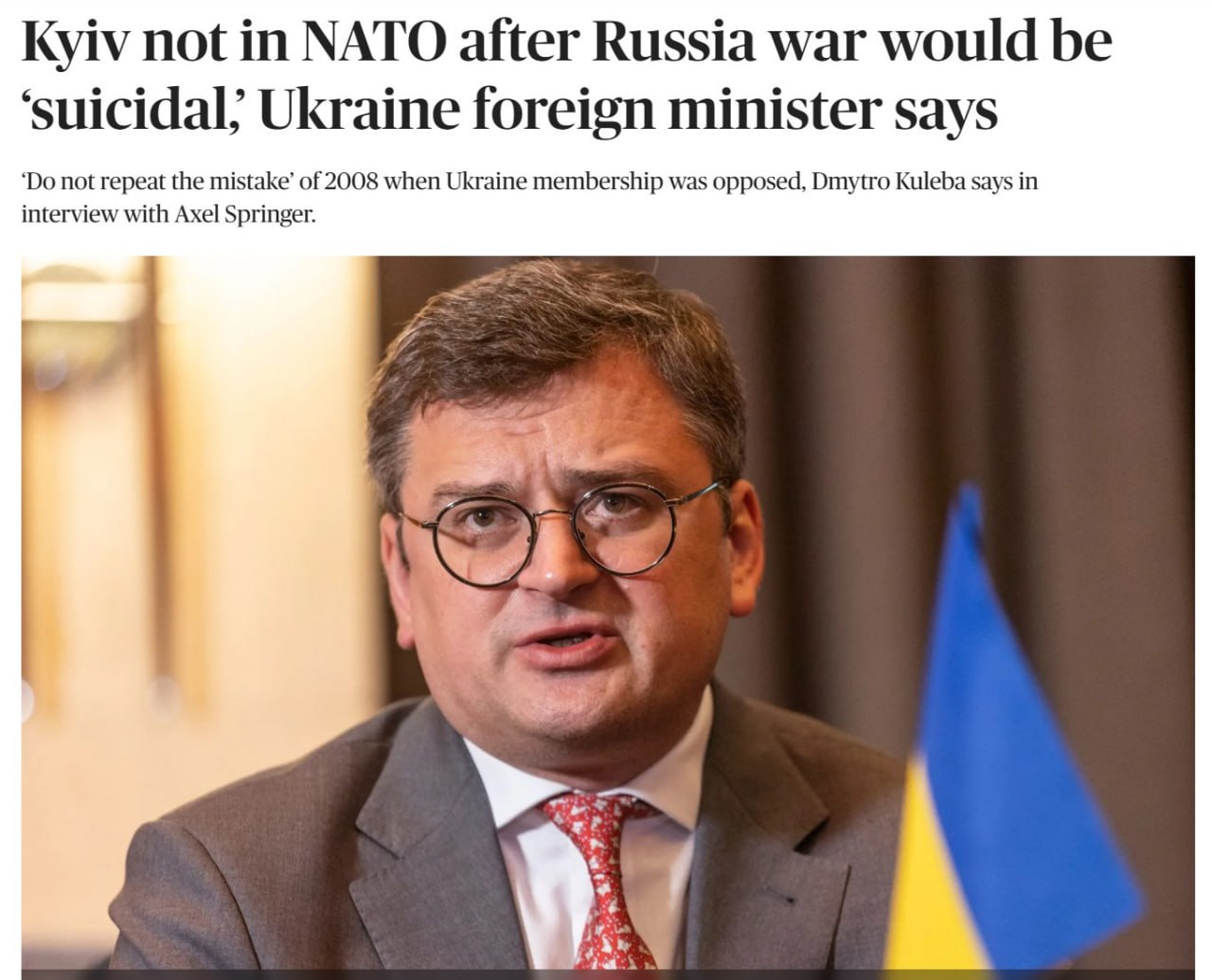 "После окончания войны для Европы будет самоубийством не принять Украину в НАТО, потому что это будет означать, что вариант … войны останется открытым", - сказал министр.