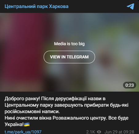 "После дерусификации названия в Центральном парке завершают убирать любые русскоязычные надписи. Сейчас очистили окна Развлекательного центра. Все буде Україна!", - отметили в парке.