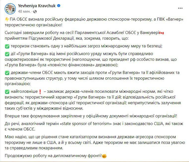 - недопустимость вовлечения таких субъектов в межгосударственные отношения", - написала Кравчук.