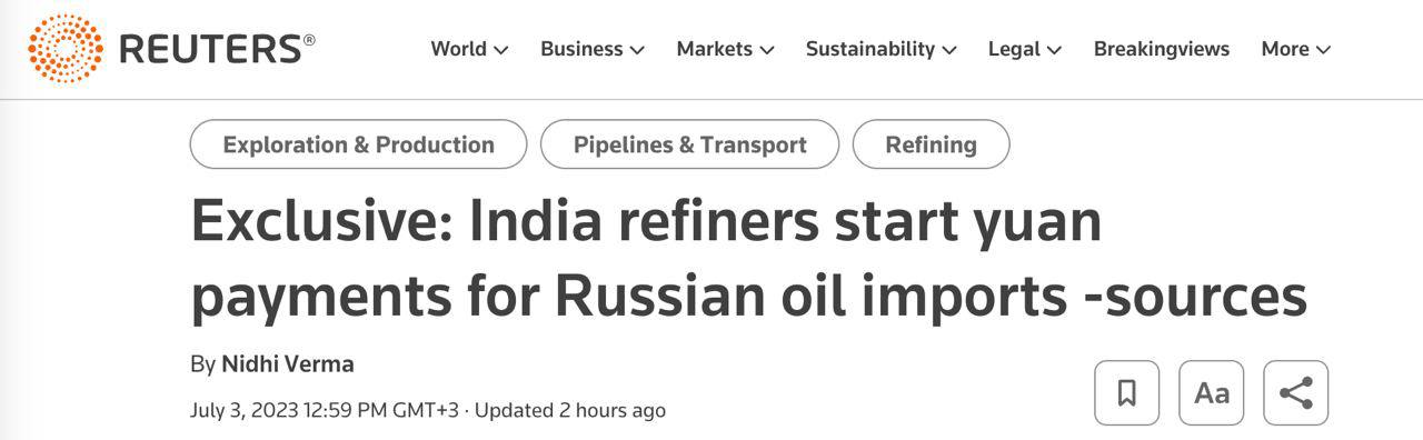 По данным издания, первый такой платеж в июне совершила нефтеперерабатывающая компания Indian Oil Corporation. Корпорация является крупнейшим покупателем российского топлива в Индии. Кроме того, на расчеты с Москвой в юанях перешли два из трех частных НПЗ страны.