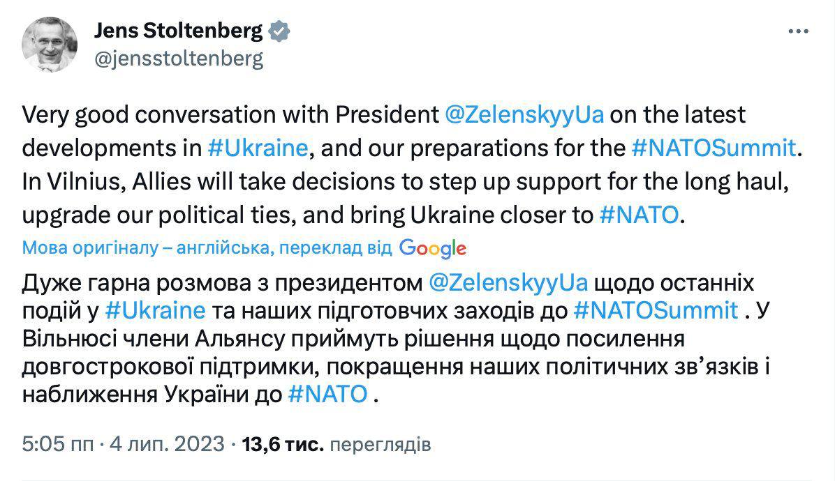 "Очень хороший разговор с президентом Зеленским о последних событиях в Украине и наших подготовительных мероприятиях к саммиту НАТО. В Вильнюсе союзники примут решения об усилении поддержки в долгосрочной перспективе, укреплении наших политических связей и приближении Украины к НАТО", - написал генсек.