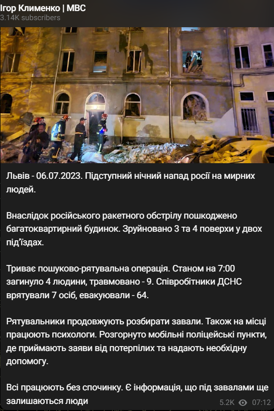 "В результате российских ракетных обстрелов поврежден многоквартирный дом. Разрушены 3 и 4 этажи в двух подъездах", - написал глава МВД Игорь Клименко.
