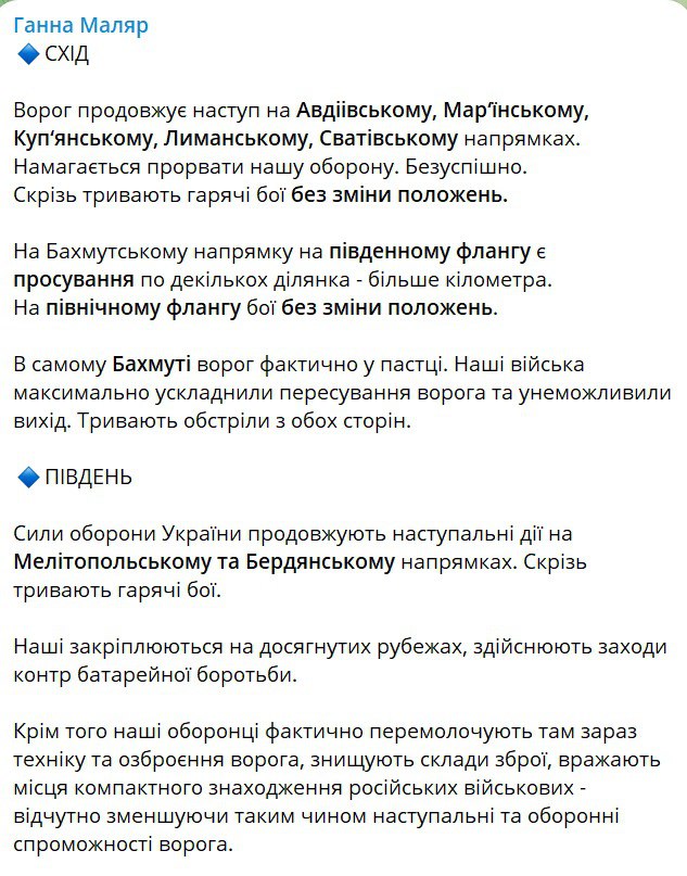 Маляр сообщила, что в самом Бахмуте россияне находятся фактически в ловушке. ВСУ "максимально усложнили" их передвижение и сделали невозможным выход.