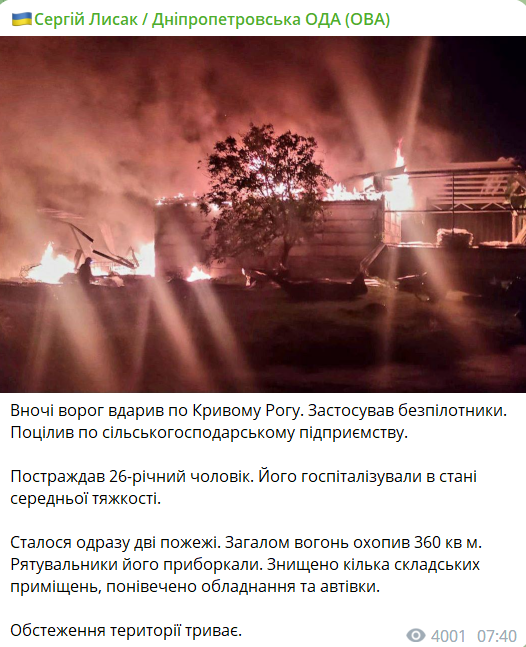 07:48 Ночью беспилотники ударили по Кривому Рогу. Есть прилет по сельскохозяйственному предприятию.