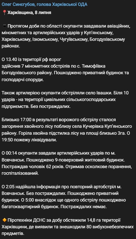 "В 00:14 оккупанты нанесли артиллерийские удары по городу Волчанск. Поврежден 9-этажный жилой дом, пострадал мужчина в возрасте 62 лет, который получил осколочное ранение и был госпитализирован.