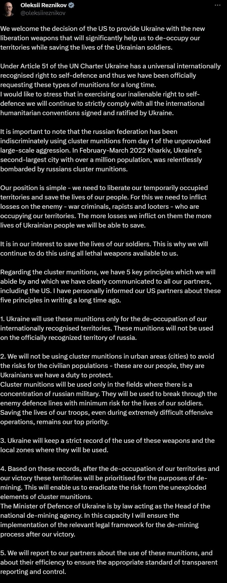 Также Резников назвал пять принципов, которых Украина будет придерживаться при применении кассетных боеприпасов: