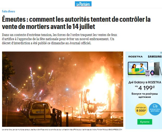 Напомним, на прошлой неделе после того, как в пригороде Парижа, полицейский застрелил несовершеннолетнего за рулем авто при проверке, по Франции прокатилась волна беспорядков с погромами магазинов и банков. Основной силой была молодежь - выходцы из семей мигрантов.