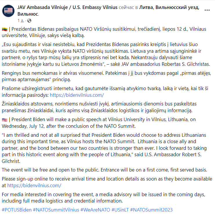 "Я очень рад и совсем не удивлен, что президент Байден решил обратиться к литовцам в это важное время, когда в Вильнюсе проходит саммит НАТО. Литва является близким союзником и партнером, и связь между нашими двумя странами сильнее, чем когда-либо. Я с нетерпением жду возможности принять участие в этом историческом событии вместе с литовским народом", – сказал посол США в Литве Роберт Гилкрист.