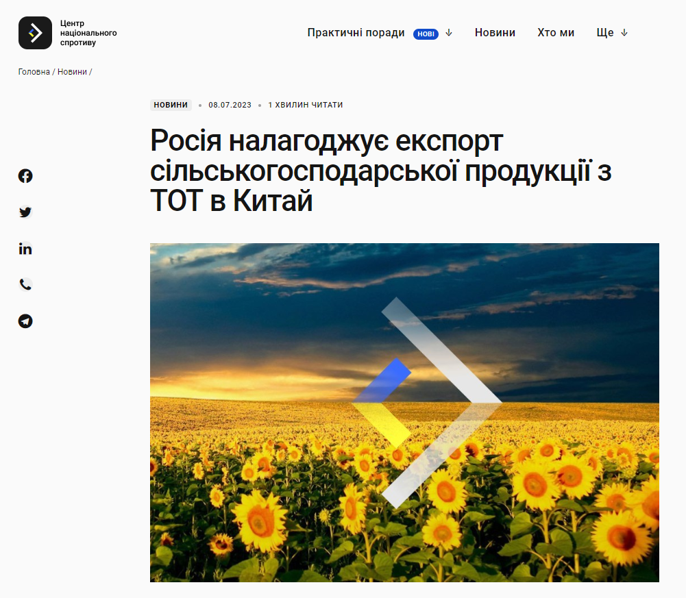 "В условиях наложенных на Россию санкций за развязывание войны против Украины, ключевым экспортером для России остается Китай. В настоящее время Россия активно вывозит похищенные зерновые с ВОТ Украины в Сирию и Турцию под видом собственного урожая", - объясняет пресс-служба.