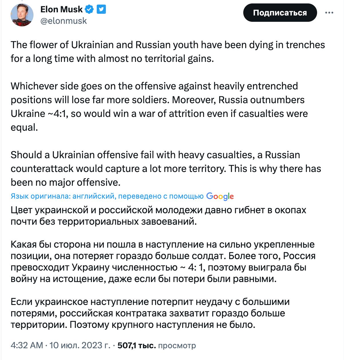 "Цвет украинской и российской молодежи давно гибнет в окопах почти без территориальных завоеваний. Какая бы сторона ни пошла в наступление на сильно укрепленные позиции, она потеряет гораздо больше солдат. Более того, Россия превосходит Украину численностью примерно 4 к 1, поэтому выиграла бы войну на истощение, даже если бы потери были бы равными. Если украинское наступление потерпит неудачу с большими потерями, российская контратака захватит гораздо больше территории. Поэтому крупного наступления не было", - пишет Маск в Твиттере.