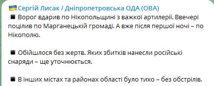 07.32 Ночью россияне ударили по Никопольщине из тяжелой артиллерии. Вечером по Марганецкой громаде. После часа ночи – по Никополю.