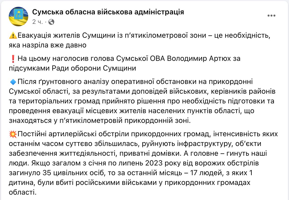 22:08 Эвакуация жителей пятикилометровой пограничной зоны в Сумской области не будет экстренной и принудительной.