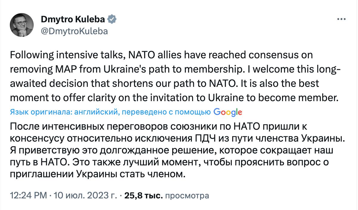 "После интенсивных переговоров союзники по НАТО пришли к консенсусу относительно исключения ПДЧ из пути членства Украины. Я приветствую это долгожданное решение, которое сокращает наш путь в НАТО. Это также лучший момент, чтобы прояснить вопрос о приглашении Украины стать членом", - написал Кулеба.