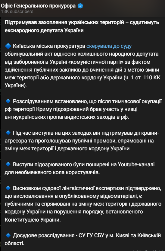 По данным прокуратуры, после аннексии Крыма подозреваемый участвовал в ряде "антиукраинских пропагандистских мероприятий" в России, в ходе которых поддержал действия Москвы.