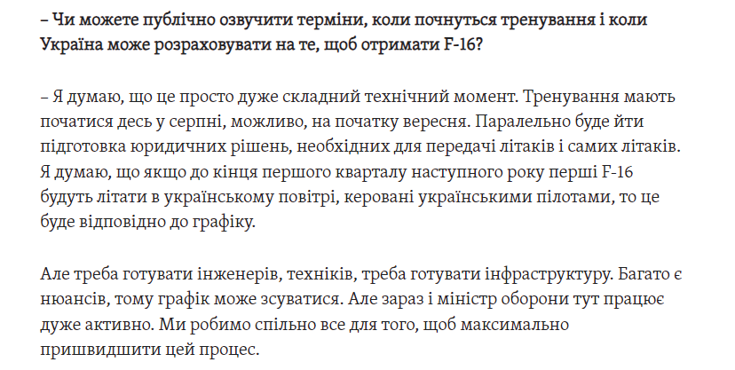 "Я думаю, что если до конца первого квартала следующего года первые F-16 будут летать в украинском воздухе, управляемые украинскими пилотами, то это будет в соответствии с графиком", - сказал глава МИД.