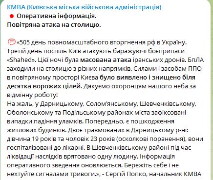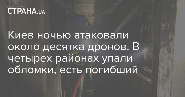 Киев ночью атаковали около десятка дронов. В четырех районах упали обломки, есть погибший