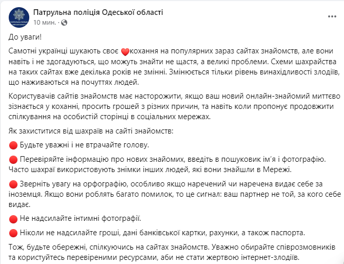 Патрульная полиция Одесской области публикует методичку, как распознать мошенника на сайте знакомств.
