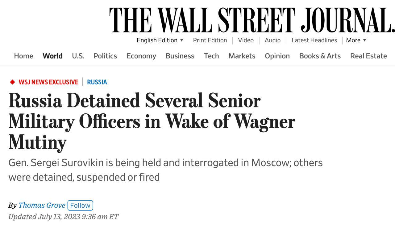 По данным издания, офицеров задержали спустя несколько часов после начала мятежа куратора ЧВК "Вагнер". Источники WSJ также утверждают, что Суровикин знал о замыслах Пригожина, но в них не участвовал. Ему пока не предъявлено никаких обвинений.