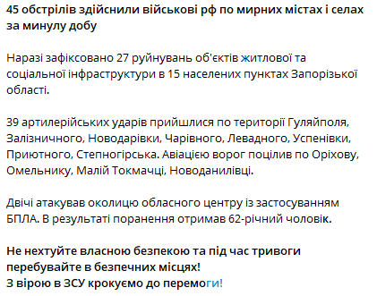 39 артиллерийских ударов пришлись по территории Гуляйполя, Железнодорожного, Новодаровки, Волшебного, Левадного, Успеновки, Приютного, Степногорска. Авиацией враг попал по Орехову, Омельнику, Малой Токмачке, Новоданиловке.