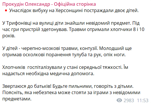 В Херсонской области дети играли с неизвестным предметом, который сдетонировал. Фото: gov.ua