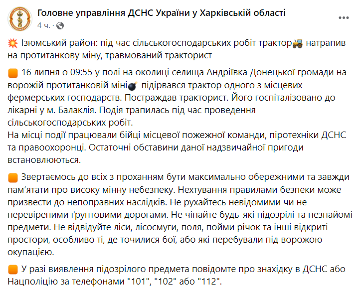 "16 июля в 09:55 в поле на окраине поселка Андреевка Донецкой общины на вражеской противотанковой мине подорвался трактор одного из местных фермерских хозяйств. Пострадал тракторист. Он госпитализирован в больницу в г. Балаклея", - говорится в сообщении.