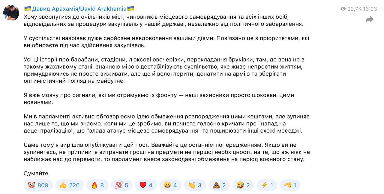 "Все эти истории о барабанах, стадионах, люксовых овощерезках, переложении брусчатки там, где она не в таком ужасном состоянии, в значительной степени дестабилизируют общество. Мы в парламенте активно обсуждаем идею ограничения распоряжения этими средствами, но останавливает нас только то, что мы знаем: когда мы это сделаем, вы начнете громко кричать о "нападении на децентрализацию", что "власть атакует местное самоуправление" и распространять другие подобные месседжи. Считайте это последним предупреждением. Если вы не остановитесь, не прекратите тратить деньги на предметы не первой необходимости, на то, что никак не приближает нас к победе, то парламент внесет законодательные ограничения на период военного положения", - заявил Арахамия.