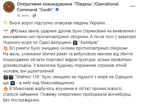 Ночью Одессу атаковали шестью ракетами "Калибр" из Черного моря, все их сбила ПВО, заявляет оперкомандование "Юг" в Facebook.