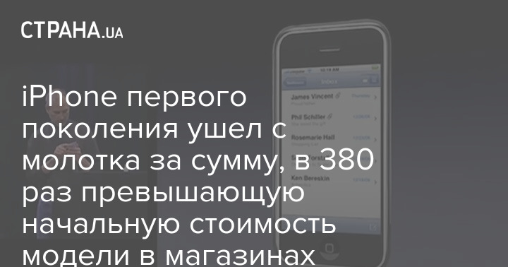 Аукционный дом LCG Auctions продал смартфон iPhone первого поколения с памятью в 4 ГБ за 190 тысяч долларов, что в 380 раз превышает изначальную цену этой модели iPhone (в 2007 году ее цена в магазинах была 499 долларов).
