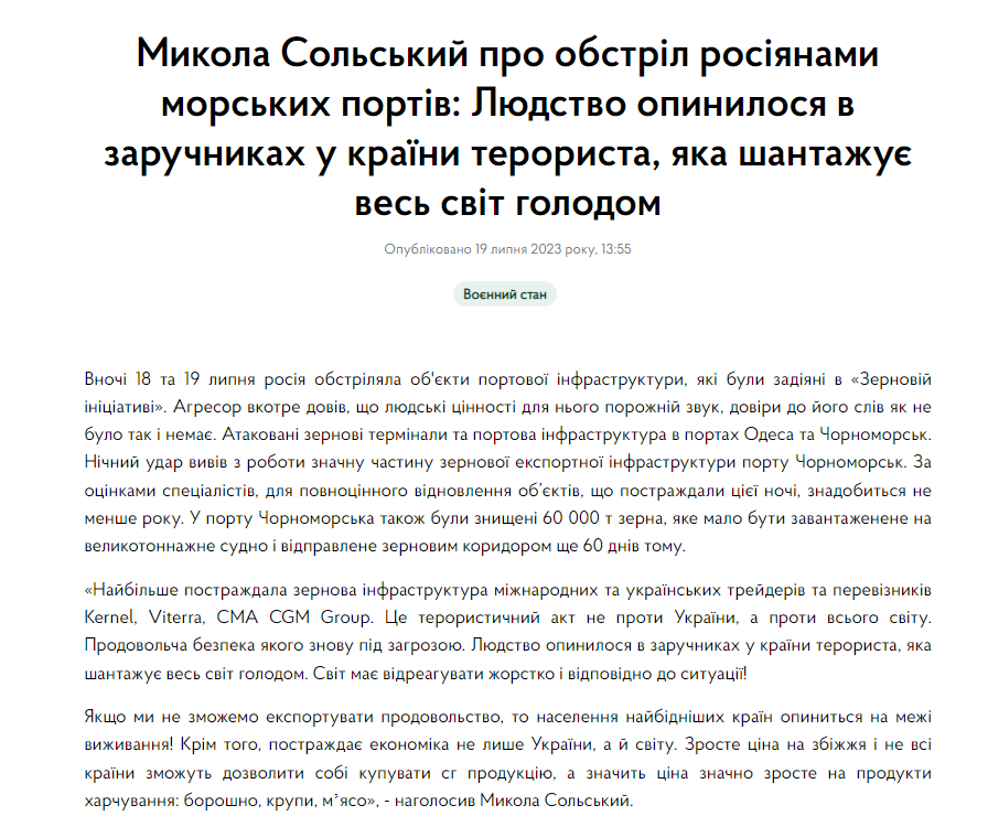 Министр аграрной политики Николай Сольский заявил, что ночной атакой Россия уничтожила 60 тысяч тонн зерна в порту Черноморска Одесской области.
