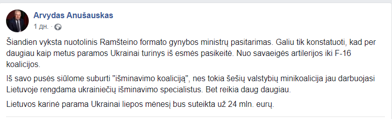 Об этом написал министр обороны Литвы Арвидас Анушаускас в своем Facebook во время совещания министров обороны в формате "Рамштайн".