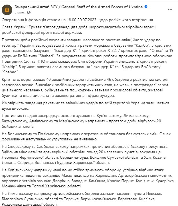 Как писала "Страна", война в Украине идет уже 512-й день. Мы следим за последними новостями и ключевыми событиями 20 июля 2023 года в онлайне.