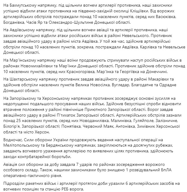 Российские оккупанты нанесли массированный ракетно-авиационный удар по территории Украины и продолжает атаковать на Купянском, Лиманском, Бахмутском, Авдеевском и Марьинском направлениях.