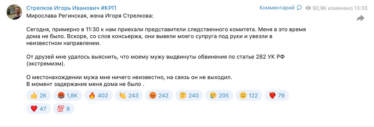 Как она написала, ее не было дома в момент задержания мужа, но консьерж рассказал, что примерно в 11:30 приехали представители Следственного комитета РФ, а вскоре вывели Стрелкова под руки и увезли в неизвестном направлении.