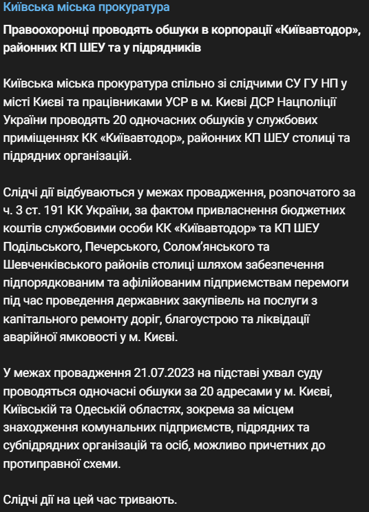 Следственные действия происходят в рамках производства, начатого по ч. 3 ст. 191 УК Украины (присвоение, растрата имущества или завладение им путем злоупотребления служебным положением).